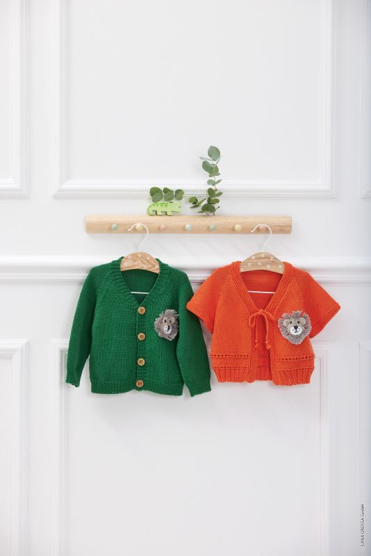 Lana Grossa-Qualität „Elastico“ (96 % Baumwolle, 4 % Polyester (Elité); Lauflänge = 160 m/50 g): 100 (150/150/200) g Flaschengrün (Fb 174) und für den Löwen- Patch Lana Grossa-Qualität „Cotton Love“ (100 % Baumwolle (Bio); Lauflänge = 170 m/50 g): je 50 g Taupe (Fb 20), Schwarz (Fb 9), Weiß (Fb 12) und Beige (Fb 18)